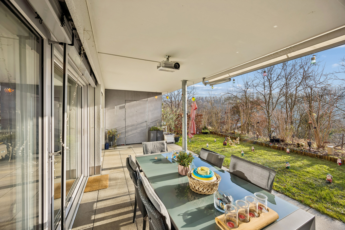 Der gedeckte Sitzplatz mit elektrischer Sonnenstore und angrenzender Grünfläche (rund 40 m2) mit Rasen und Pflanzenrabatte steht zur ausschliesslichen Benutzung zur Verfügung und lädt zum Entspannen im Freien ein. Ein praktischer Abstellraum für Gartengeräte ergänzt das Angebot.