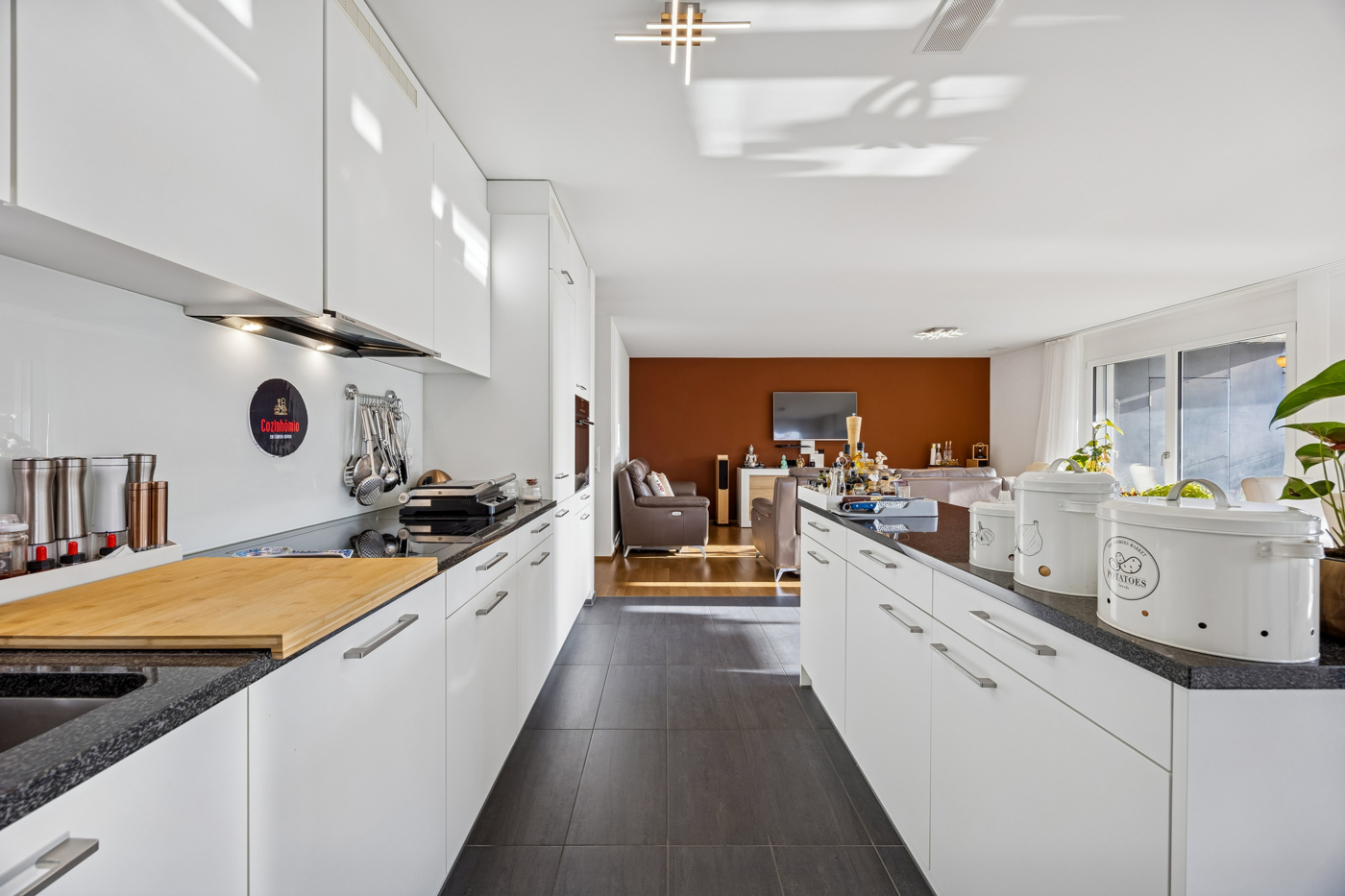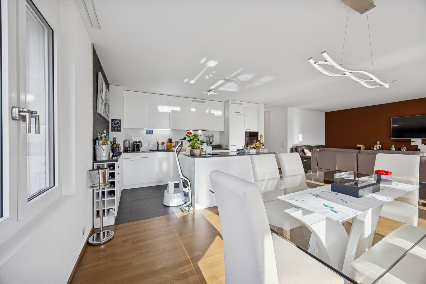 Bereits beim Eintreten überzeugt der grosszügige Eingangsbereich mit praktischer Einbaugarderobe und Einbauschränken. Die helle, offen gestaltete Küche mit keramischen Bodenplatten, moderner Kücheninsel, Granitsteinabdeckung und hochwertigen Einbaugeräten fügt sich harmonisch in den Wohnraum ein. Das lichtdurchflutete Wohn- und Esszimmer mit Parkettboden, grosser Fensterfront und Hebeschiebetüre bietet direkten Zugang zum gedeckten Sitzplatz und schafft eine angenehme Wohnatmosphäre.